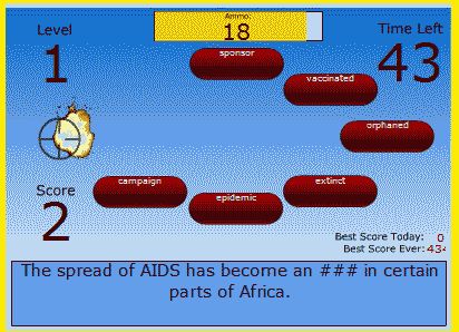 You can create a variety of interactive games on the Internet using classtools.net. The basic game-maker program is available free of charge. Use Gerry's Vocabulary Teacher to create contexts, replace the blank ____________ with the symbols ###, and have the target vocabulary as the answers. Complete instructions for creating the games are available on the website. We have found the best game template to be: Arcade Game Generator - WordShoot. Click on the image below to give it a try! Each level of the game gets increasingly challenging.